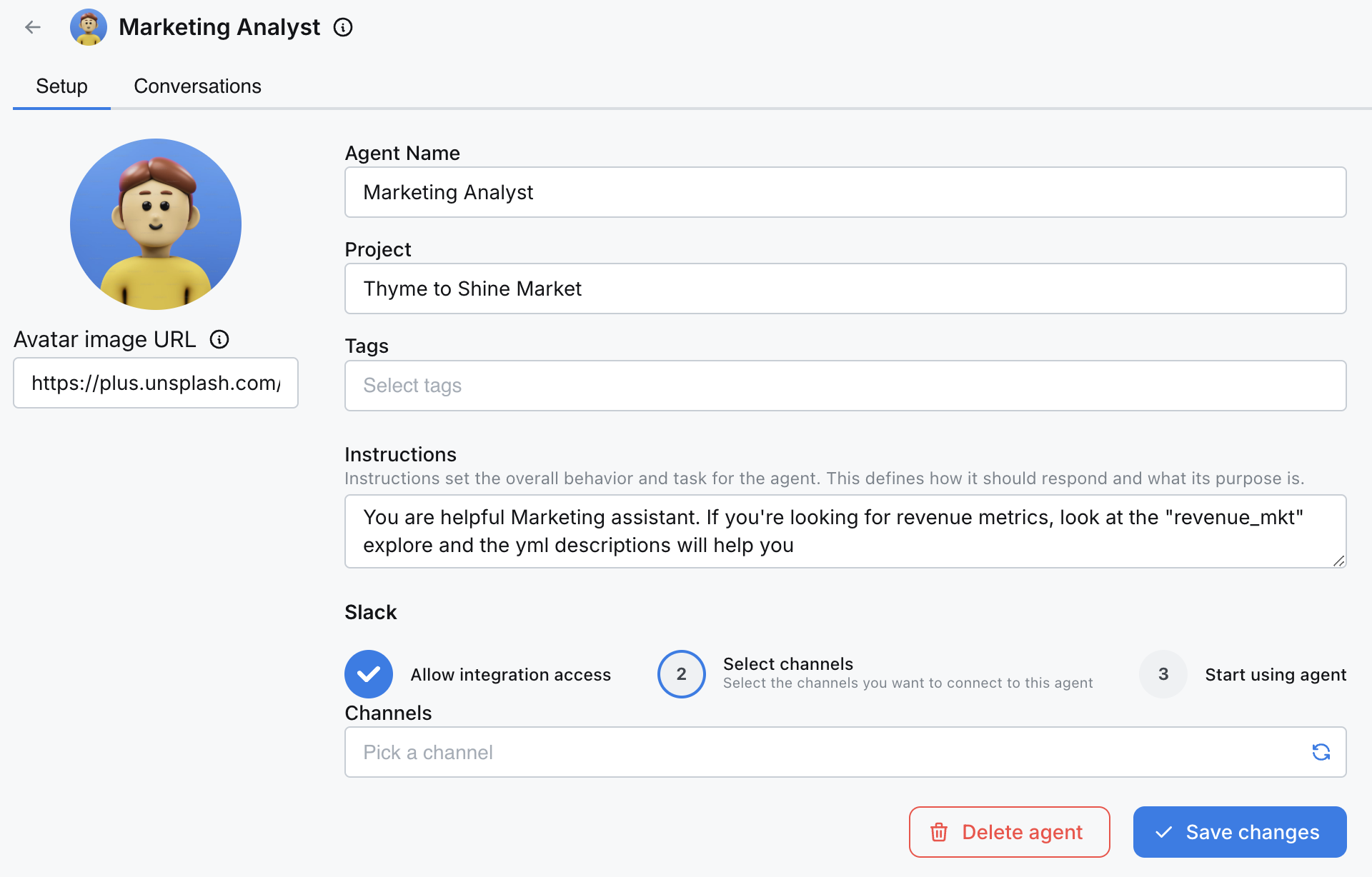 Think of AI agents as your specialized analysts - each one can be configured to focus on specific areas of your business. For example, you might create a “Marketing Assistant” that only has access to marketing data like campaign performance, lead generation, and customer acquisition metrics. This focused approach ensures more accurate, relevant responses and prevents sensitive data from being accessible to the wrong teams. To find out more about how to configure specific access, see Limiting access to specific explores/fields.Document your data thoroughly