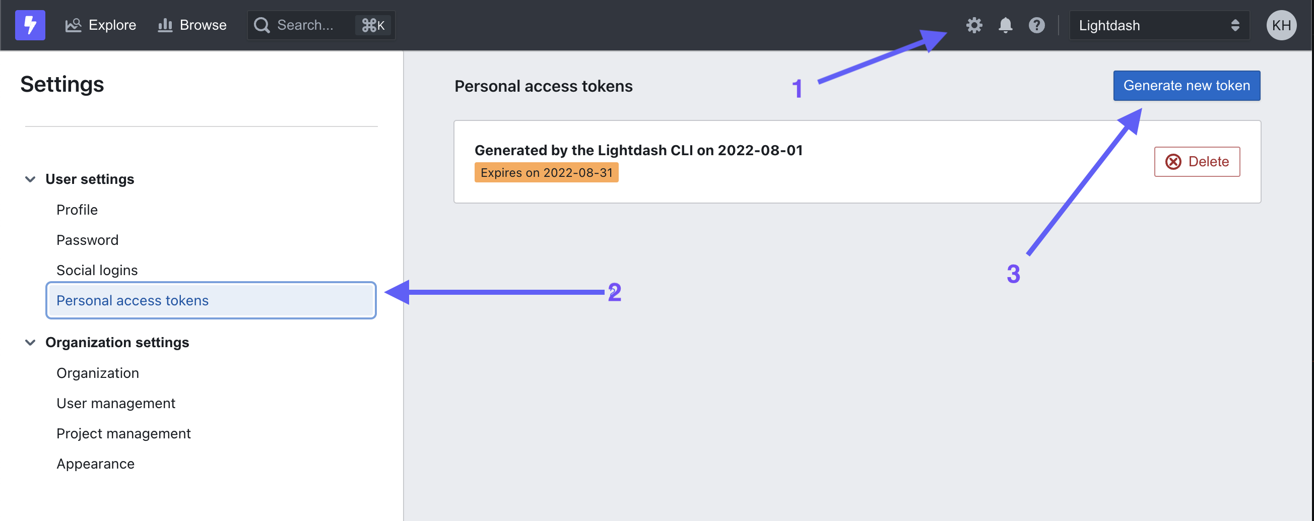 Create a new personal access token, by going to Settings > Personal Access Tokens. This is the token you’ll put in for LIGHTDASH_API_KEY.