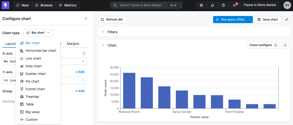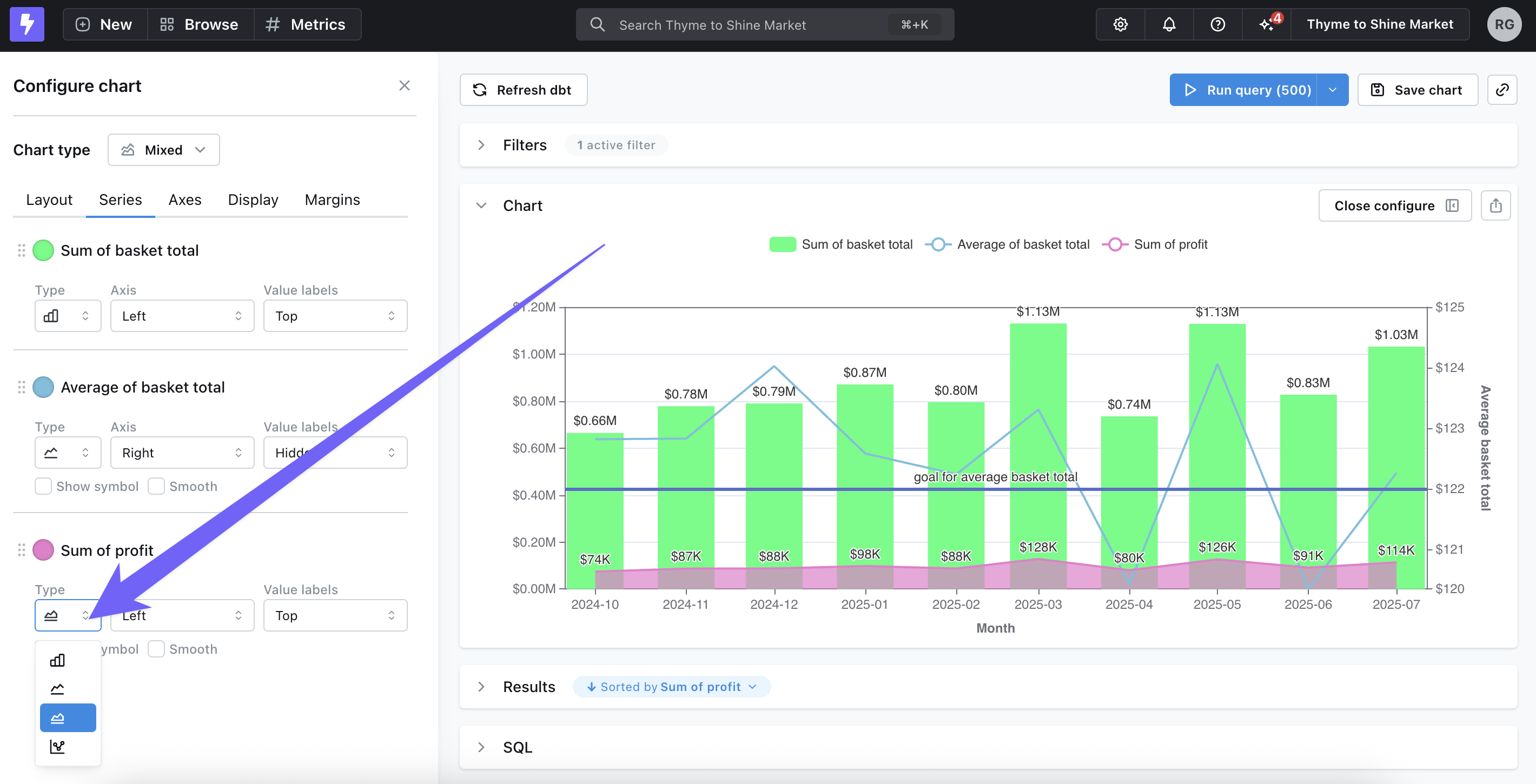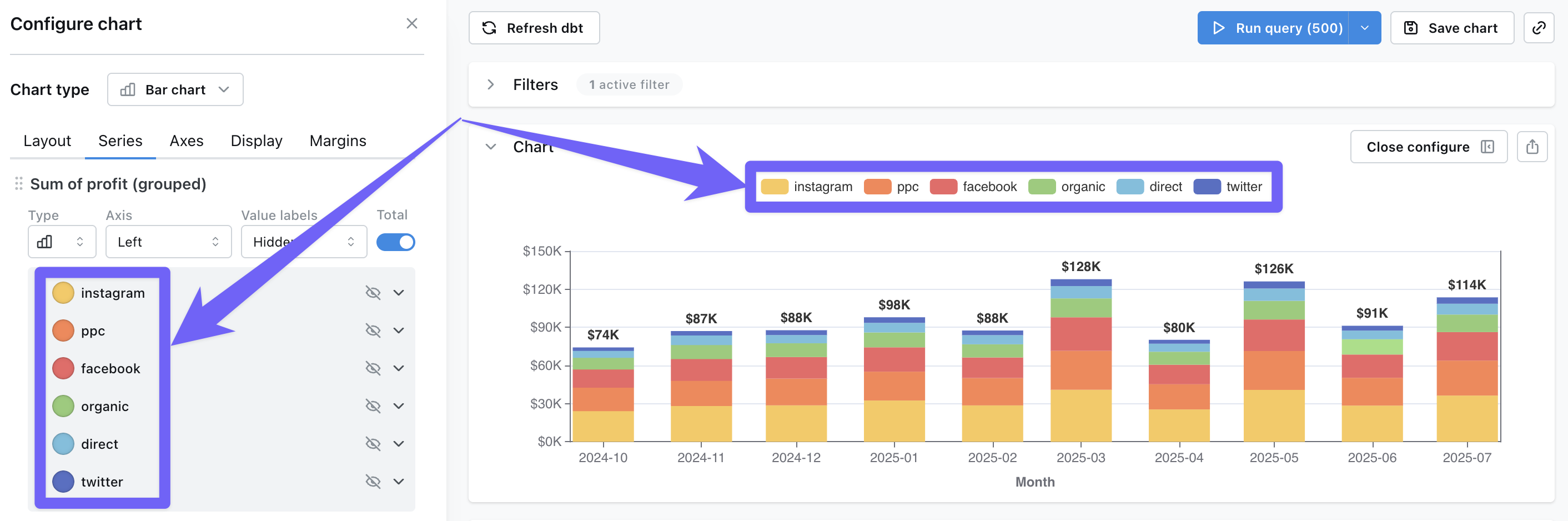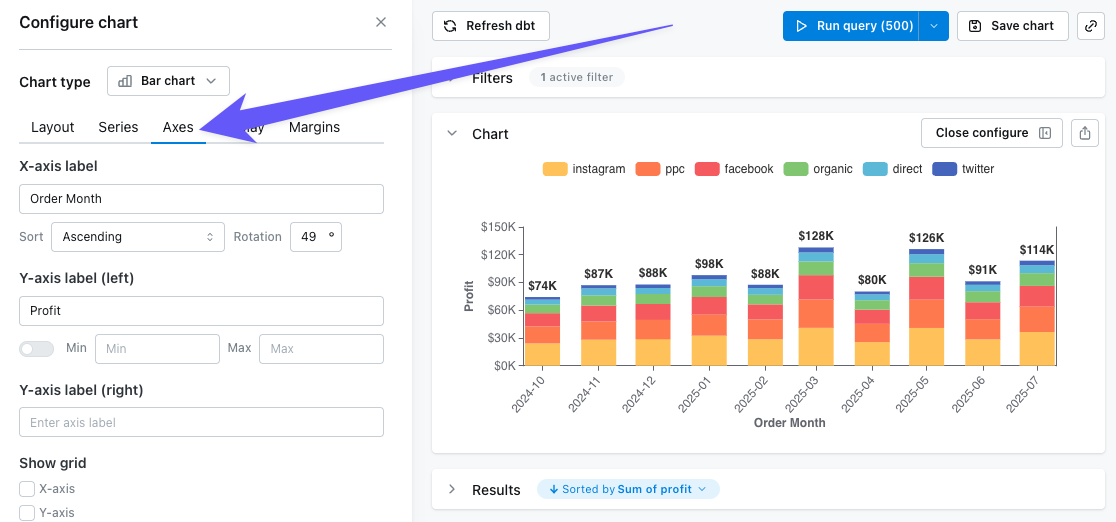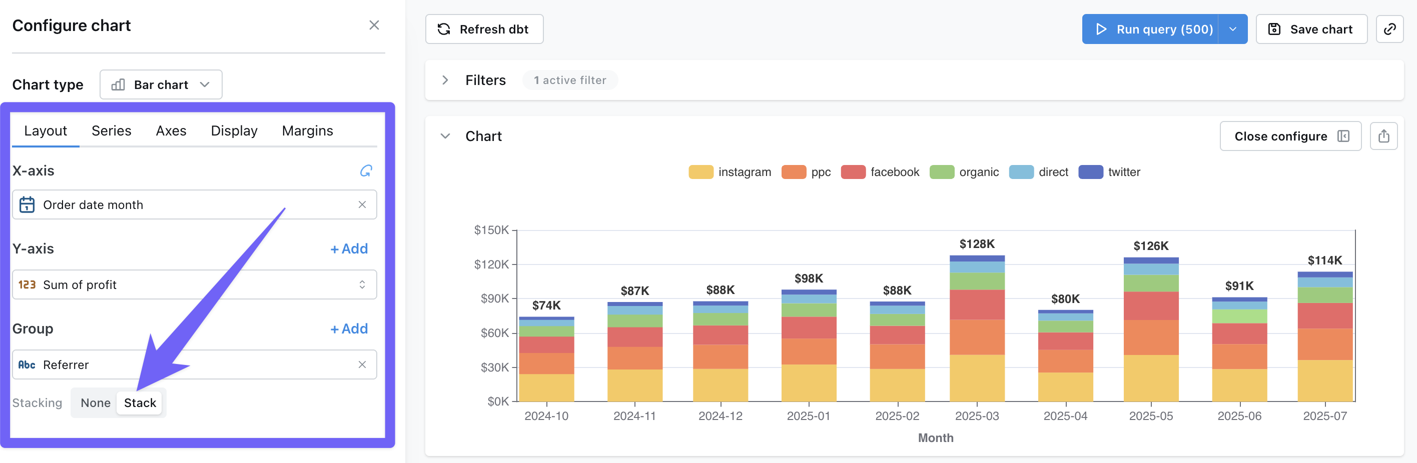 This is where you can pick the columns from your results table that you want to plot on your x and y axes or that you want to group by. You can group by up to 3 fields in your chart. For bar charts, this is also where you have the option to stack your bars, or leave them unstacked (grouped).