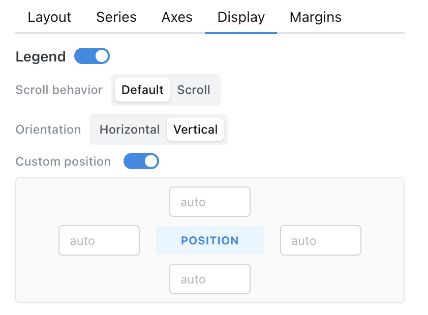 positionare the coordinates of the legend on your chart. They can either be numbers or percent. We suggest using %. - If you want the position to be in the bottom right, you would set: Right = 0%, Bottom = 0%. For the legend to be in the middle of the chart, you’d set: Top = 50%, Left = 50%.