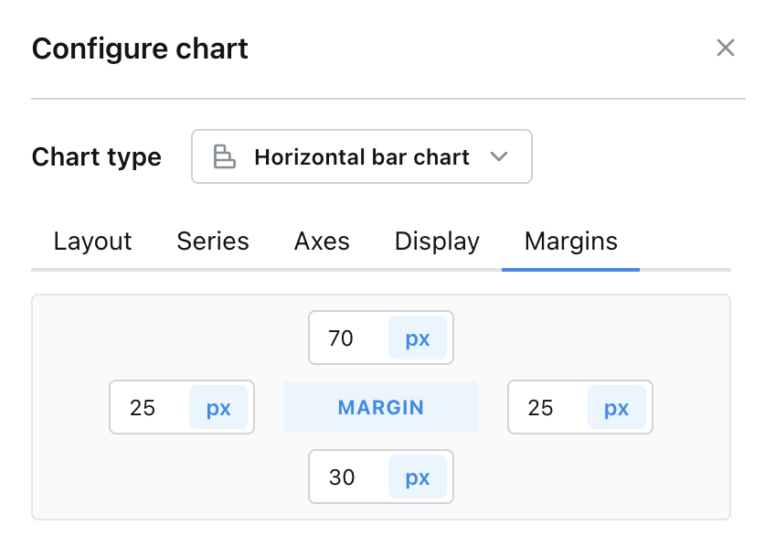 The Margin tab is where you’re able to add or remove margin around the grid. Removing margin means that your chart will fill more of the space in the chart tab. Adding margin will shrink your chart into a smaller space. You can either add numbers (e.g. 50) or percent values (e.g. 50%) to the margin settings listed. The default margin is set totop = 70, bottom = 30, left = 5%, right = 5%
