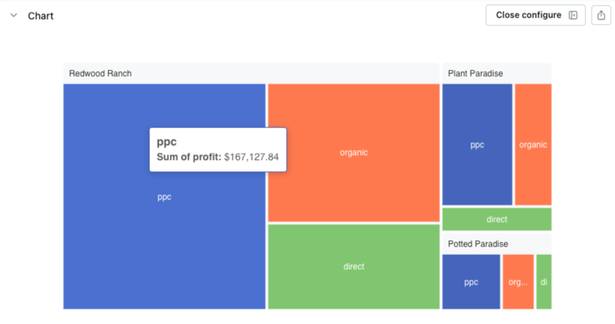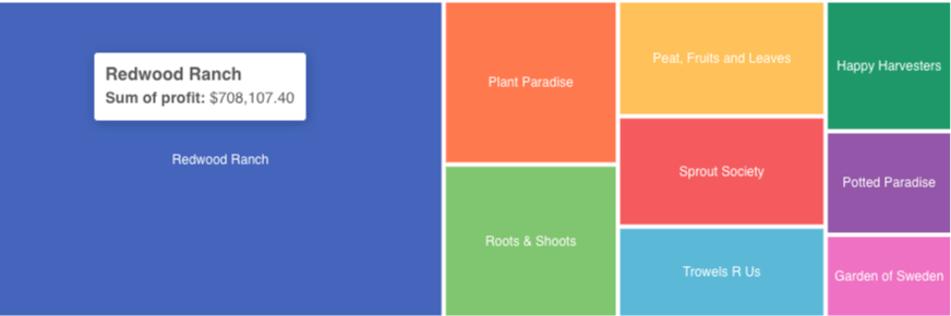 Treemaps show parts of a whole using nested rectangles. Each rectangle’s size represents the value of a metric, and dimensions define how the data is grouped and nested. You can use a single dimension or multiple and they will work as described below. One dimension: Each category becomes a rectangle, sized by the metric value.