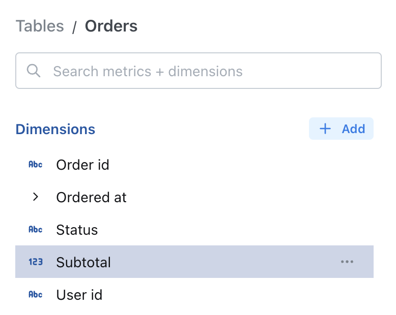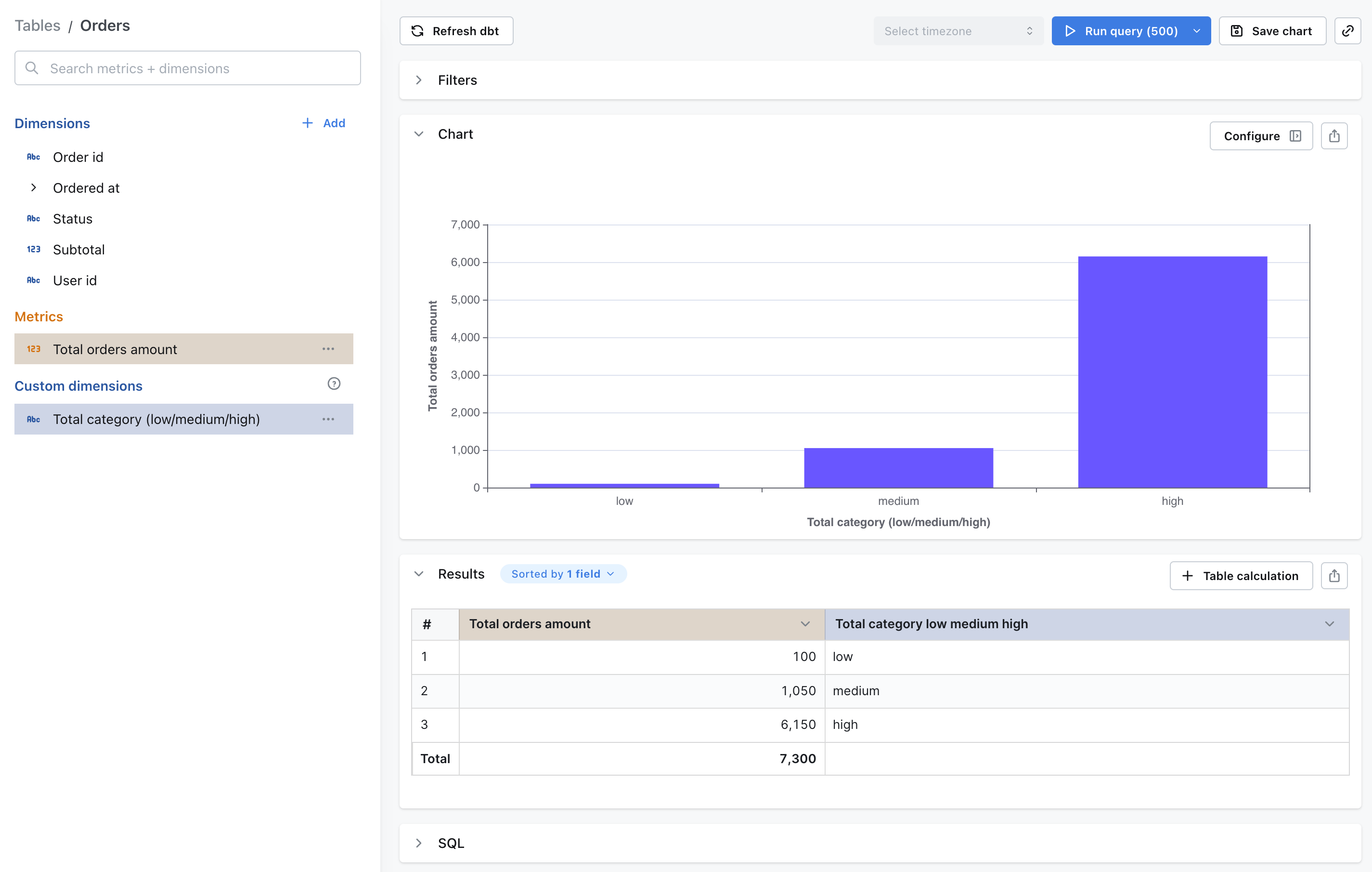 In this example, let’s explore theorders table and create a custom dimension that categorizes my orders’ totals into three categories: low, medium, and high.