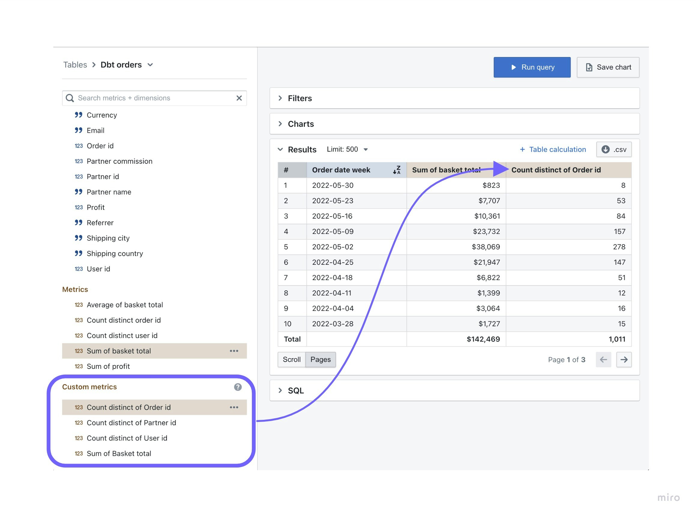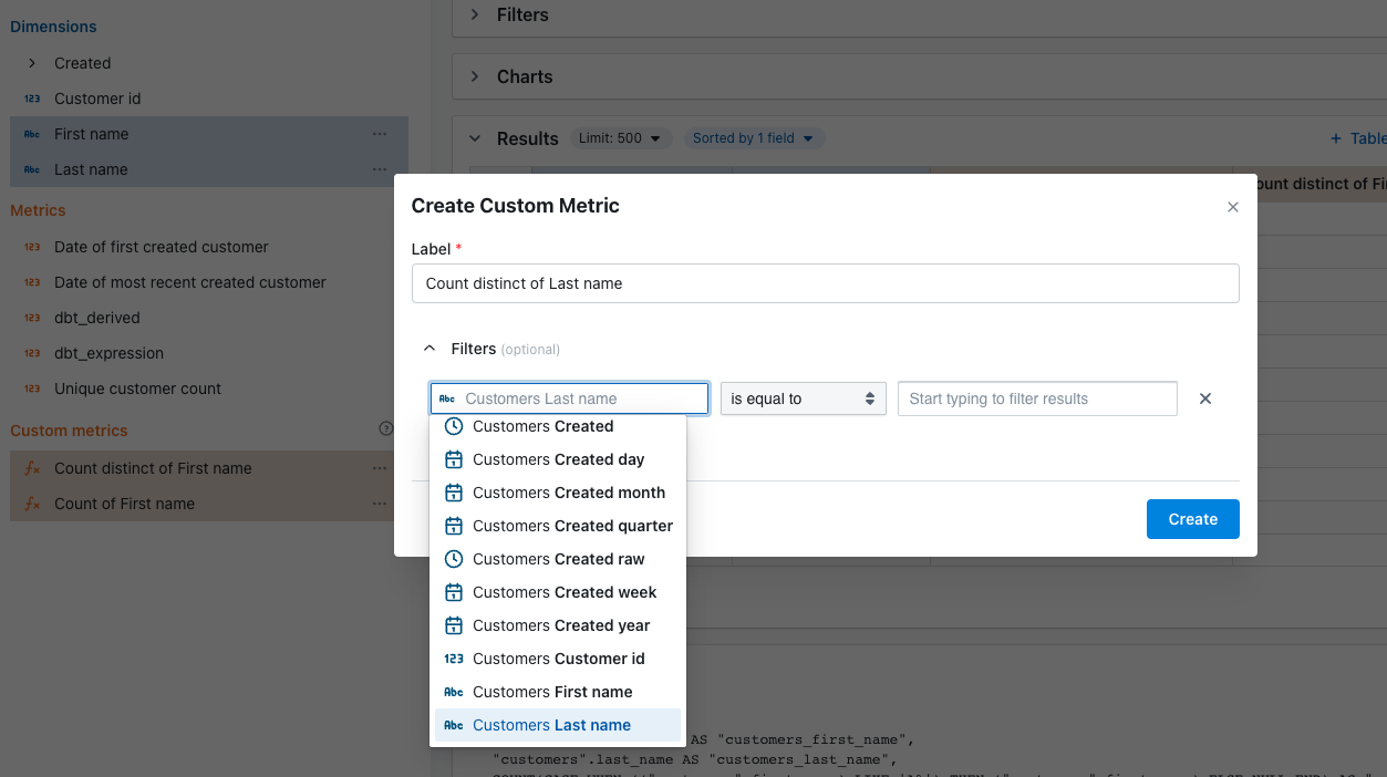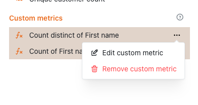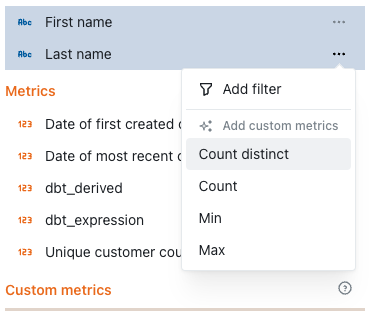 Custom metrics are only saved in the chart they’re used in and will not be saved in the list ofmetrics available if you open the same Table to build a new chart. Metrics written to your dbt project (or YAML metrics) are reusable by everyone in your project and will always show up in the side bar of available metrics for a Table. We recommend writing back custom metrics that you’re using/creating frequently so they become reusable, governed and available for everyone else to build from.
